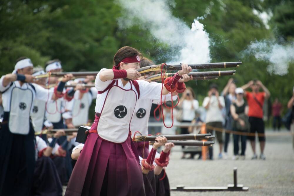 砲術隊は全国初の女性の砲術隊「桜隊」も加わり、大名行列出発の前に鶴岡公園で演舞が行われます。