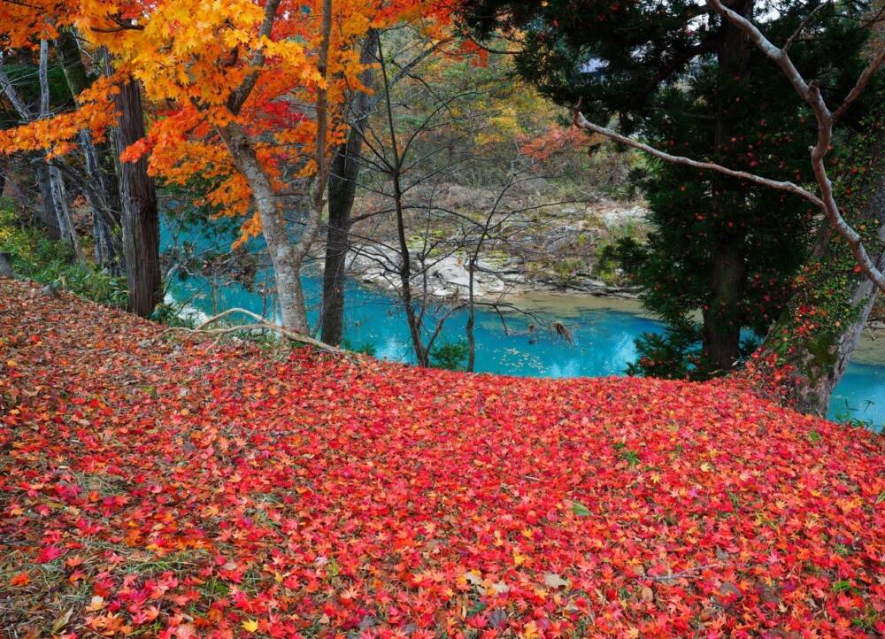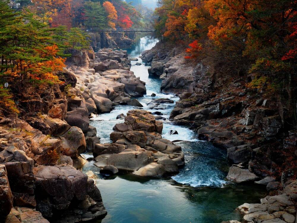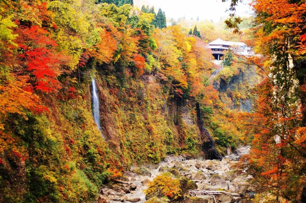 深い断崖に大小の滝が流れ落ち、自然が作り出した迫力ある峡谷に赤や黄色の紅葉が映え、絶景を作り出します。