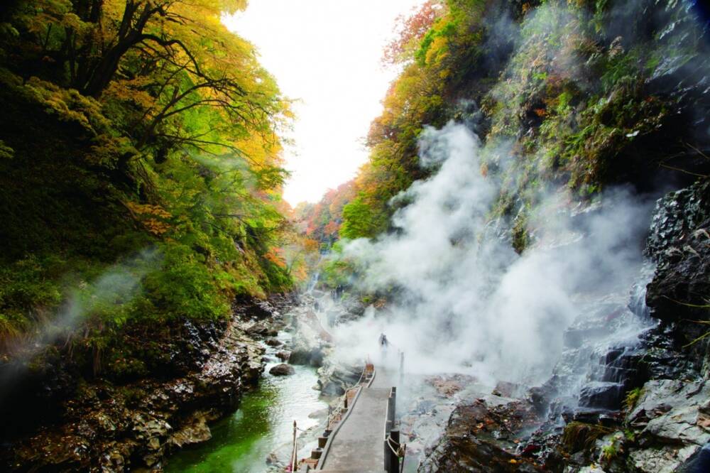 深い谷底からごう音とともに高温の温泉が吹き出し、湯けむりが立ち込めている所が「大噴湯」と言われている小安峡で一番人気のあるビュースポットです。