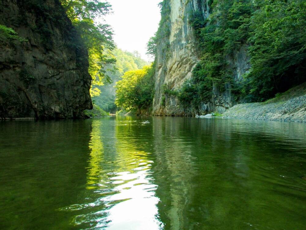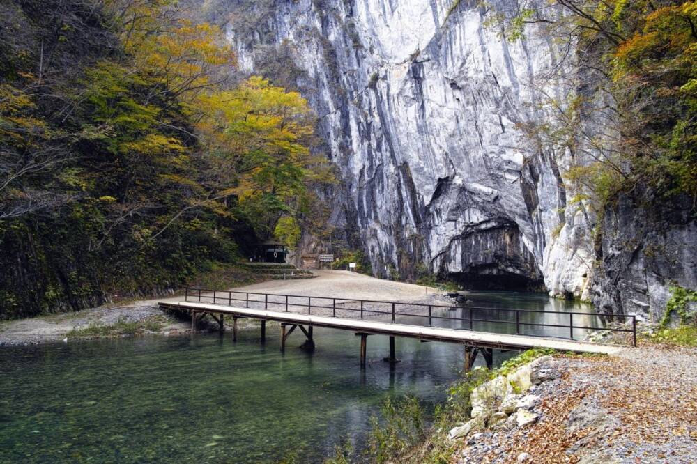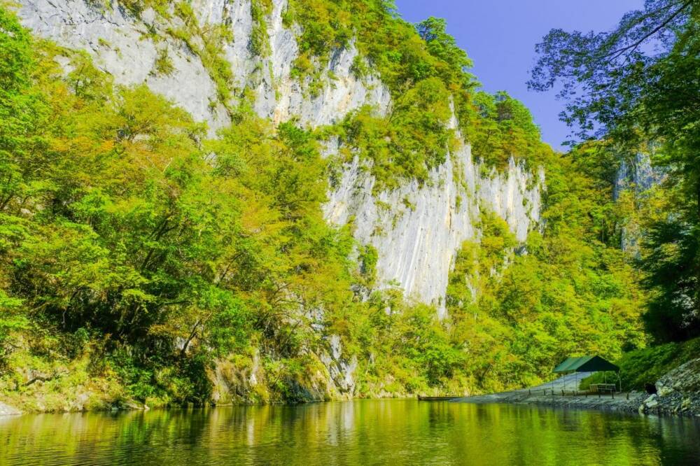 猊鼻渓は、砂鉄川が石灰岩を侵食してできた約2kmにわたる渓谷です。川岸には高さが50mを超す断崖絶壁がそびえ、幻想的な深山幽谷です。猊鼻渓の名物として知られているのが、船頭が棹一本で巧みに舟を操る舟下りです。舟下りの見どころは、舟の進む先々にそそり立つ珍しい形の大きな岩の数々。