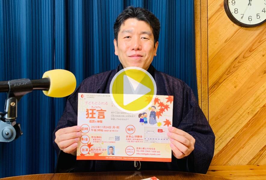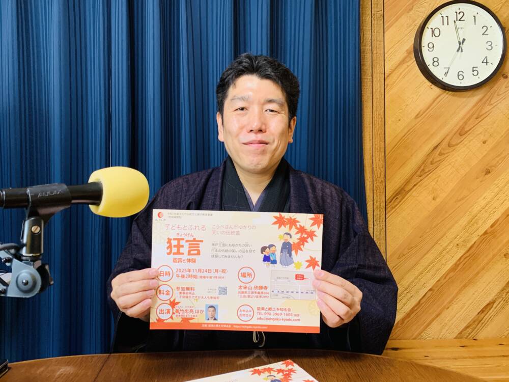 今回はスタジオに、能楽と郷土を知る会から代表の朝原広基さんをお迎えして、近況と能と狂言についてお聞きした後、11月24日(月・振休)三田市桑原にある欣勝寺で開催される「子どもとふれる狂言鑑賞と体験」についてご紹介いただきました。参加無料ですので、伝統芸能に興味のあるお子さんにぜひおすすめです。