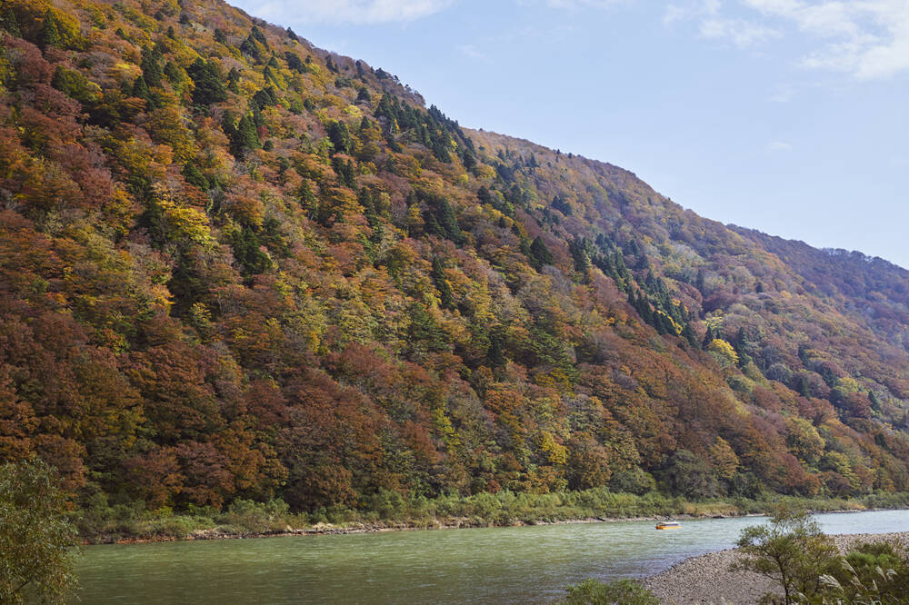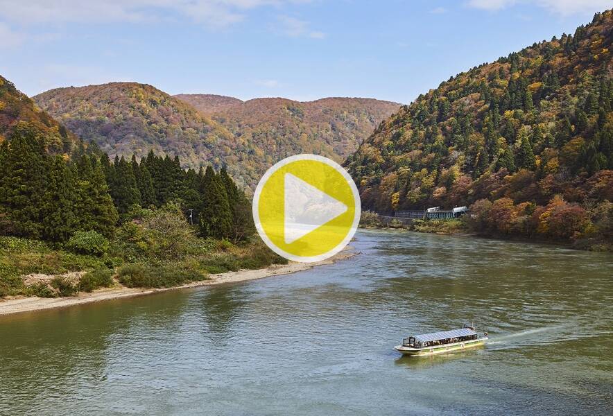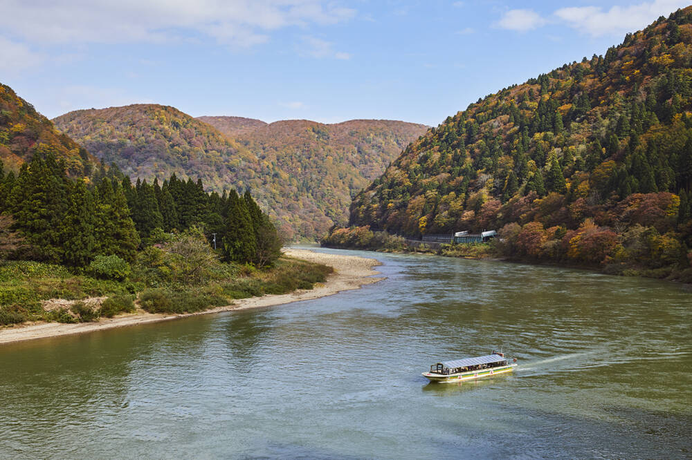 両岸から山が迫る雄大な景色に圧倒されることでしょう。最上川の流れに身をまかせて、それに船頭さんが唄う最上川舟歌が加われば、癒しのひとときが過ごせること間違いなしです。春には両岸の山の緑の中に、色鮮やかなピンク色の山桜があちらこちらに。初夏には清々しい風と共に見渡す限りの新緑が目の前に。今の季節は、両岸の山々が紅葉でオレンジや黄色に染まります。色とりどりの紅葉が水面に映る風景もみどころのひとつです。