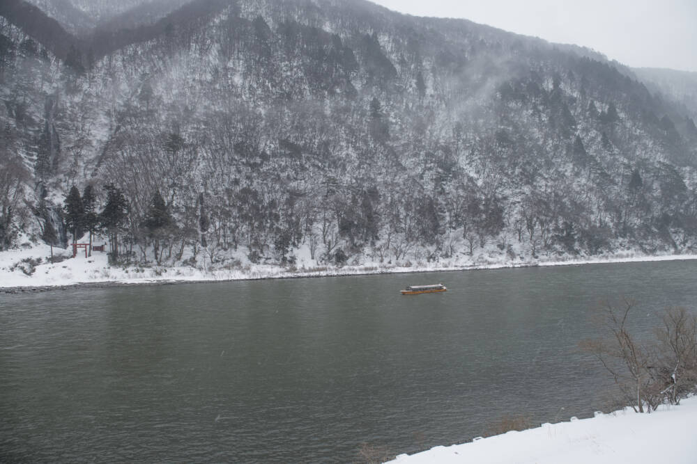 冬になり雪が積もると、周りの山が白と黒の二色に染まり水墨画の世界に迷い込んだかのような風景がご覧いただけます。12月から3月はこたつ船が運航され、足元からポッカポカ。それに熱燗と美味しいお弁当で至福のひとときが味わえます。地元食材満載の舟中弁当は種類が豊富で、どれにしようか迷ってしまうほど。山形の芋煮や鮎の塩焼きもお弁当に追加出来るそうです。最上川舟下りの最大の魅力は、船頭さん自慢の美声を披露してくれる「最上川舟唄」。世界三大舟唄と言われるだけあって、英語や中国語などの舟唄も披露してくれるそうですよ。船頭さんの方言たっぷりなトークも魅力的です。運行時間は約60分、大人 片道3000円です。