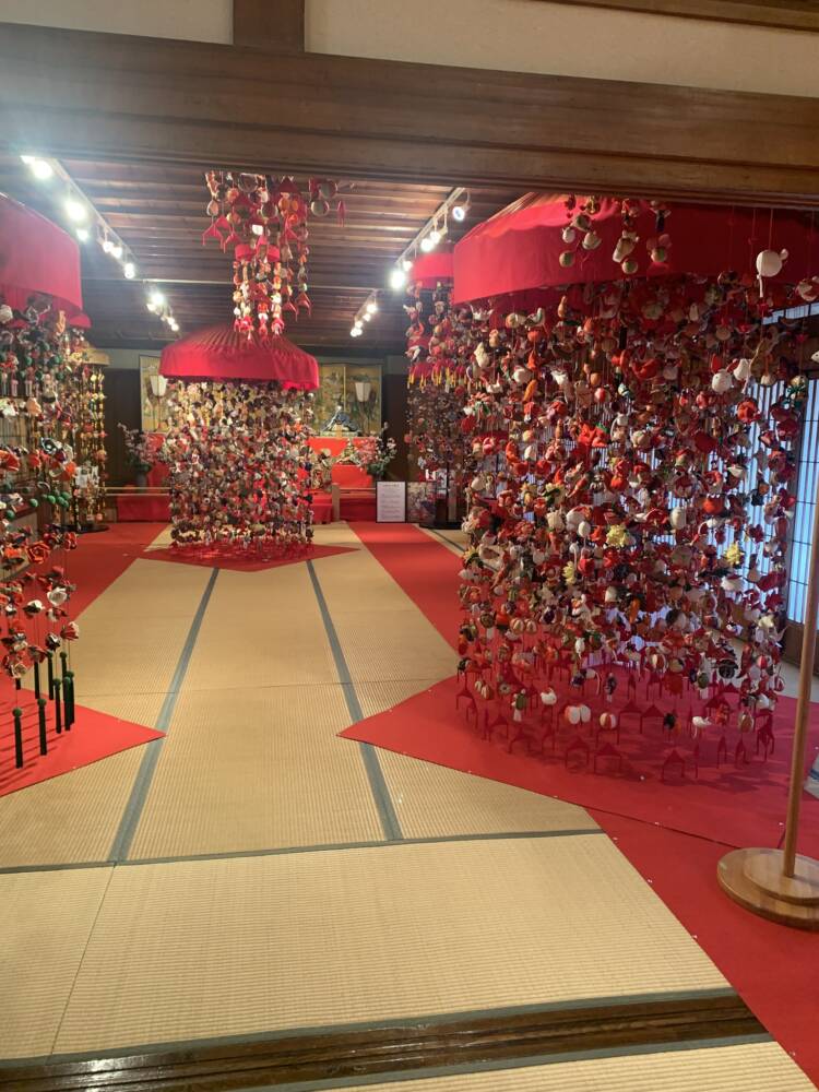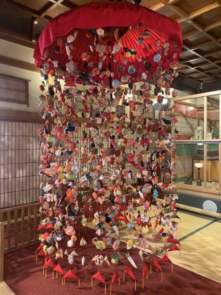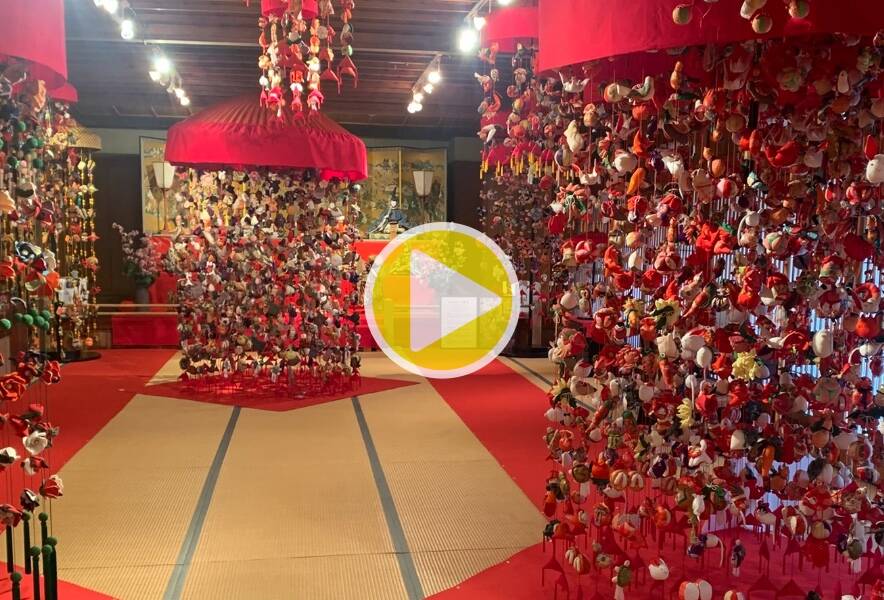 また、明治28年建築の料亭を使用した博物館「山王くらぶ」では二階の襖仕切りを外した百六畳の大広間に辻村寿三郎の作品「さかたの雛遊び」が常設展示され、期間中は「傘福」の展示も行われています。「傘福」は日本三大吊るし飾りの一つに数えられ、赤い幕を張った傘の下に、子どもの健康や家族の幸せなど一つ一つに意味を持たせた細工物を飾るのが特徴です。「傘福」の飾り物は約100種類もあり、例えば「ねずみ」の飾りは子孫繁栄を、赤い「さるっ子」は災いが「去る」ようにという魔除けとして、「おくるみ人形」は、子どもの健やかな成長を願って作成されています。飾りが吊るされる傘は大きいもので直2mもありひとつの「傘福」に999個の飾りが吊るされているそうです。一本の紐につるす飾りの数は縁起を考えて割れない数字「奇数」と決まっています。今年の新作をはじめとして、会場は1万個近い手作りの吊るし飾りで埋め尽くされます。今年で30周年を迎える「酒田雛街道」を記念して3月7日に、テレビ番組「開運なんでも鑑定団」に出演している日本人形鑑定士の林直輝氏の講演と日本人形の鑑定会が行われる予定です。