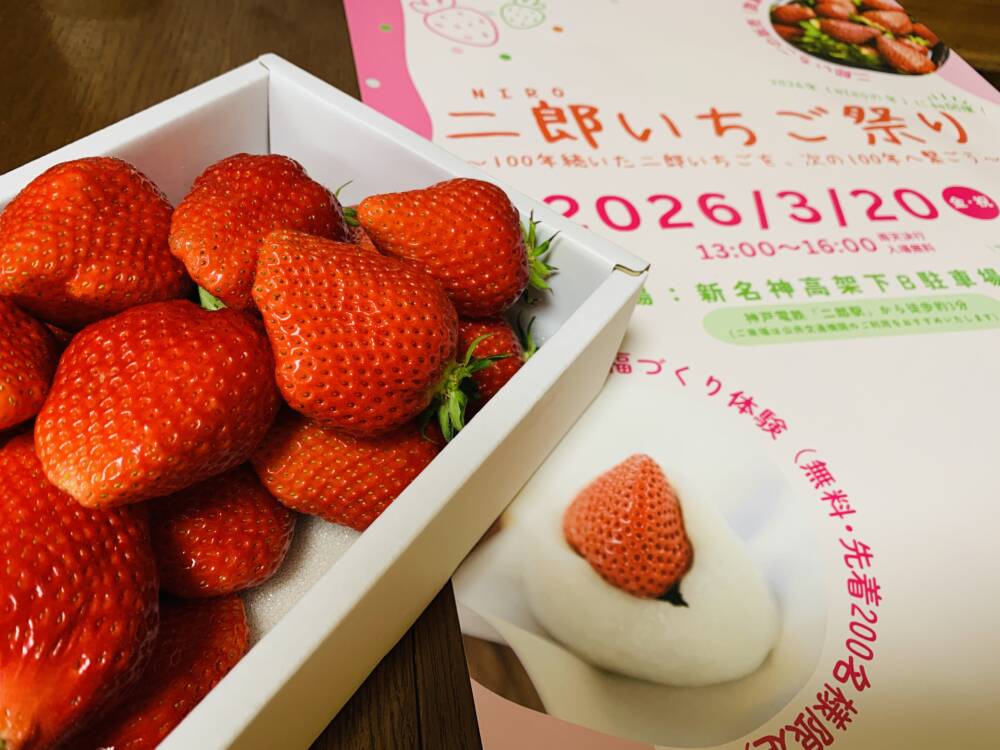 今回は、二郎いちご青年部会長の西勉さんをお迎えして、3月20日(金・祝)に初めて開催する「二郎いちご祭り」について、まずは二郎いちごの歴史と特徴、まぼろしのいちごと言われる所以、「二郎いちご祭り」開催の経緯、無料でできるいちご大福づくり体験や二郎いちごの販売など当日のお楽しみ情報をお聞きしました。神鉄二郎駅から徒歩約3分の新名神高架下特設会場で開催されます、ぜひ公共交通機関を使ってお出かけくださいね。