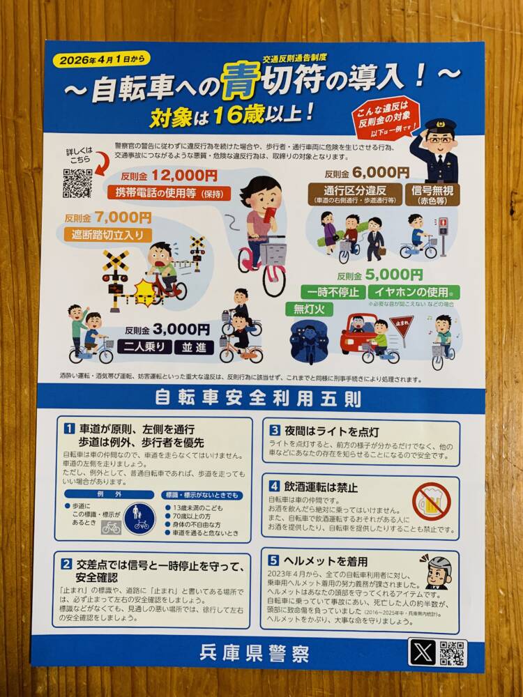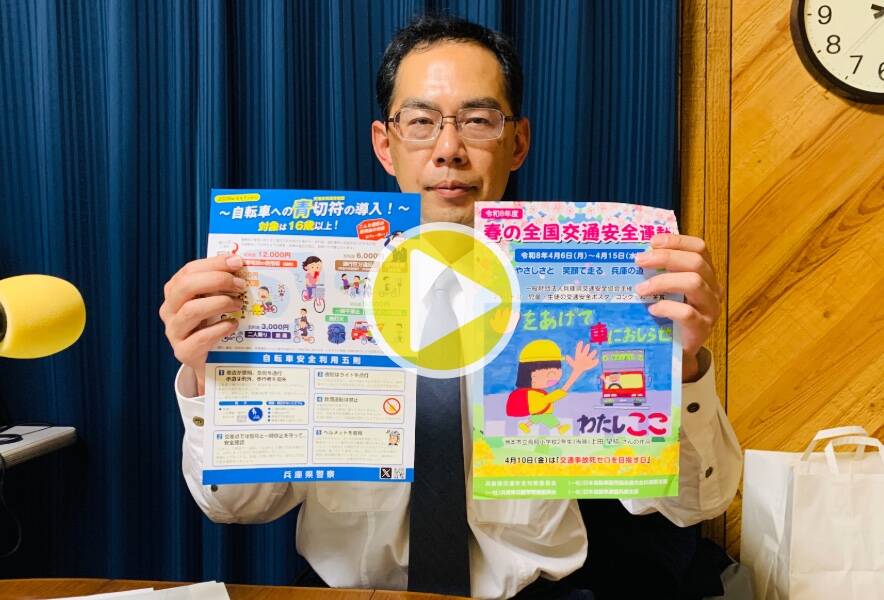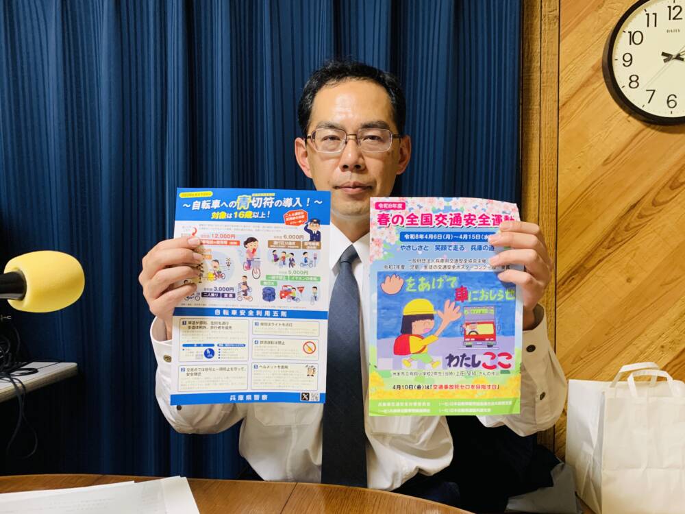 今日のカフェテラスは、三田警察署交通課から末澤さんをお迎えして、4月1日から導入される自転車への青切符について、制度のポイント、対象になる年齢、制度改正の背景、青切符になる違反の例として「自転車に乗りながら携帯電話の使用等(保持)」「二人乗りや並んで走る並進」「無灯火での運転」など、自転車のヘルメット着用、自転車保険の加入義務についてお聞きしました。