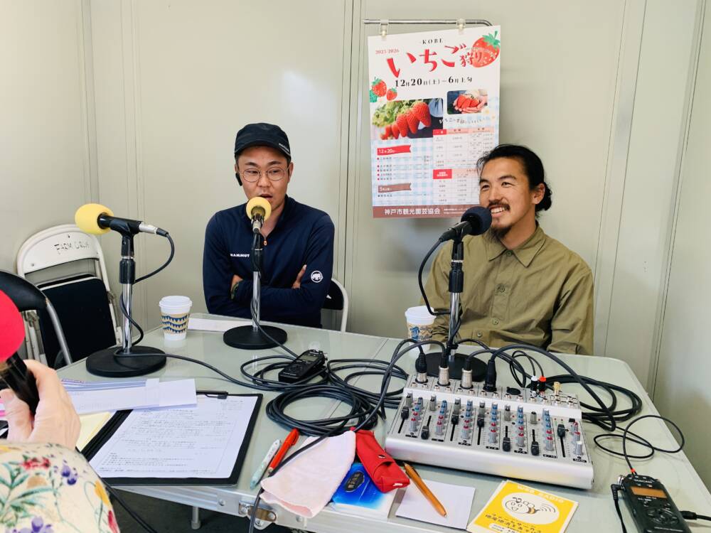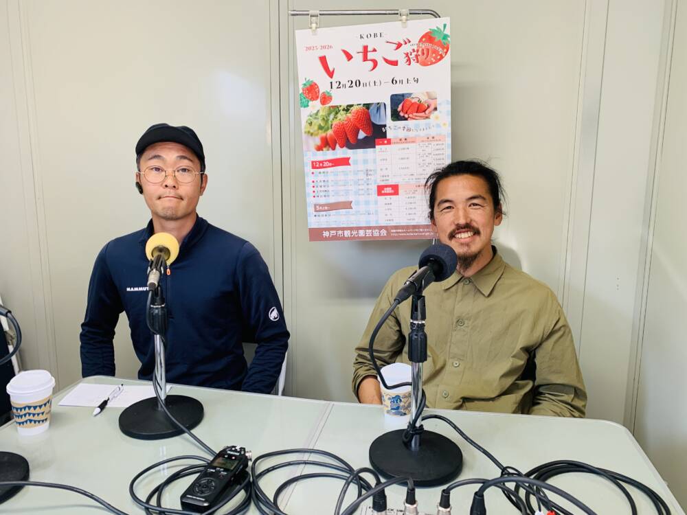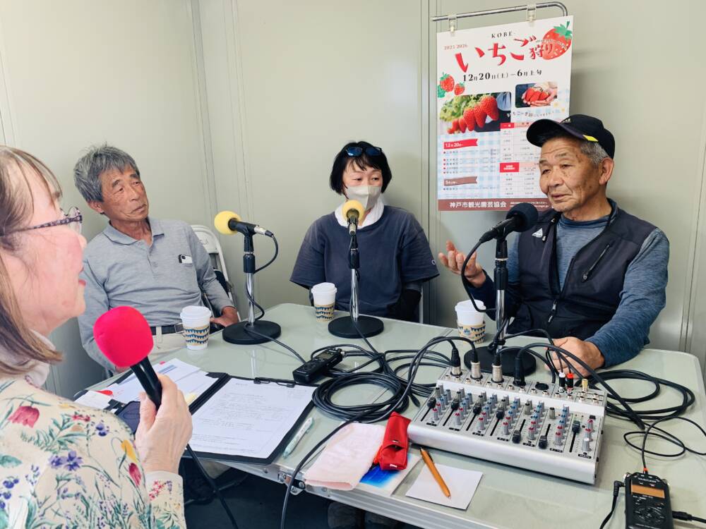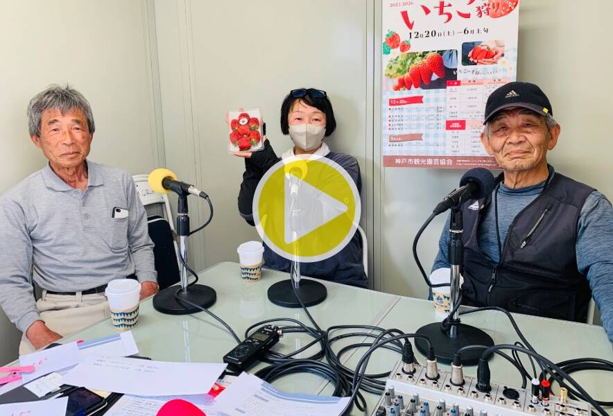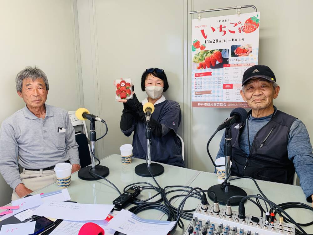 今月は神戸市北区大沢町でいちごを生産されている皆さんにお越しいただきました。今週は、池本農園の池本喜和さん、70farmの板谷奈鳳さん、ココカファームの小西健一さん、ファーマシア久保の久保裕紀さん、Bon Farmの福永通凡さんに、大沢でいちご生産や農園を始めた経緯、農園で栽培されているイチゴの種類と特徴、生産する時のこだわりや気を使うこと、美味しい食べ方などお聞きしました。