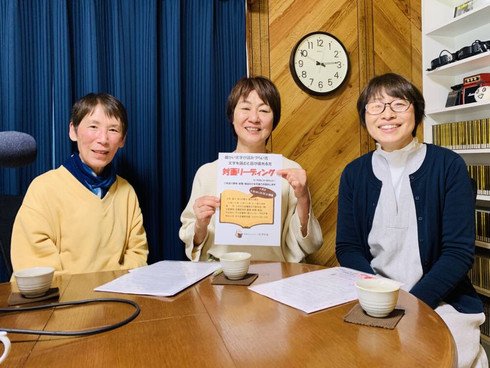 音訳ボランティア つむぎの会の活動について、元メンバーの宮山美沙子さん、メンバーの福泉幸子さん、能勢由紀子さんにお越しいただき、皆さんが音訳ボランティアの活動を始めたきっかけ、活動の楽しさ、やりがい、難しさ、そして大切にされていることなどをお聞きしました。